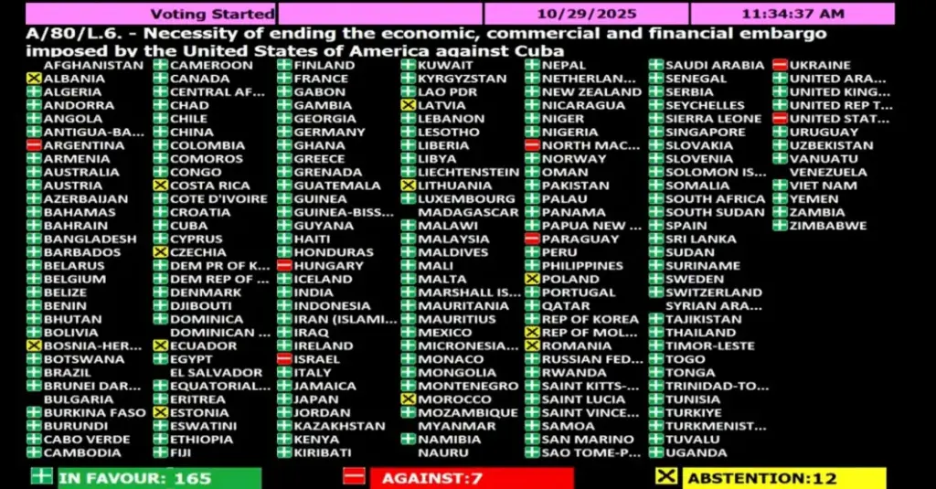 Ergebnis der UN-Abstimmung am 29.10.2025 über die kubanische Resolution zur Beendigung der US-Blockade Kubas: Mit sieben Gegenstimmen und 12 Enthaltungen stimmten 165 Länder für den kubanischen Antrag. Nachdem im letzten Jahr mit den USA und Israel nur zwei Länder gegen die Resolution Kubas stimmten, wurde von der Trump-Regierung Druck auf zahlreiche Länder ausgeübt. Genützt hat es nichts. Neben den USA und Israel stimmten 2025 die Ukraine, Nordmazedonien, Paraguay, Ungarn und Argentnien mit Nein. Mehr Länder als im Vorjahr enthielten sich. Eine übergroße Mehrheit verurteilte jedoch wieder, wie bereits seit Jahren, die völkerrechtswiedrige US-Blockade Kubas.