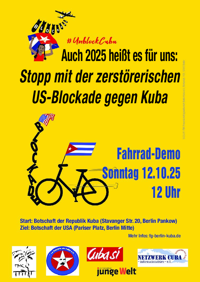 Botschaft der Republik Kuba Stavanger Str. 20, BerlinAuch 2025 heißt es für uns: Stopp mit der zerstörerischen US-Blockade gegen Kuba!!! Seit der siegreichen Selbstbefreiung Kubas bekämpfen die Eliten in den USA das Nachbarland mit allen Mitteln ununterbrochen. Nichts ließen sie unversucht, den Aufbau einer sozialistischen Gesellschaft zu behindern, das fortschrittliche Gesellschaftssystem Kubas zu zerstören. Zu den kriminellen Mitteln gehörten und gehören geheimdienstliche, ... Weiterlesen ...